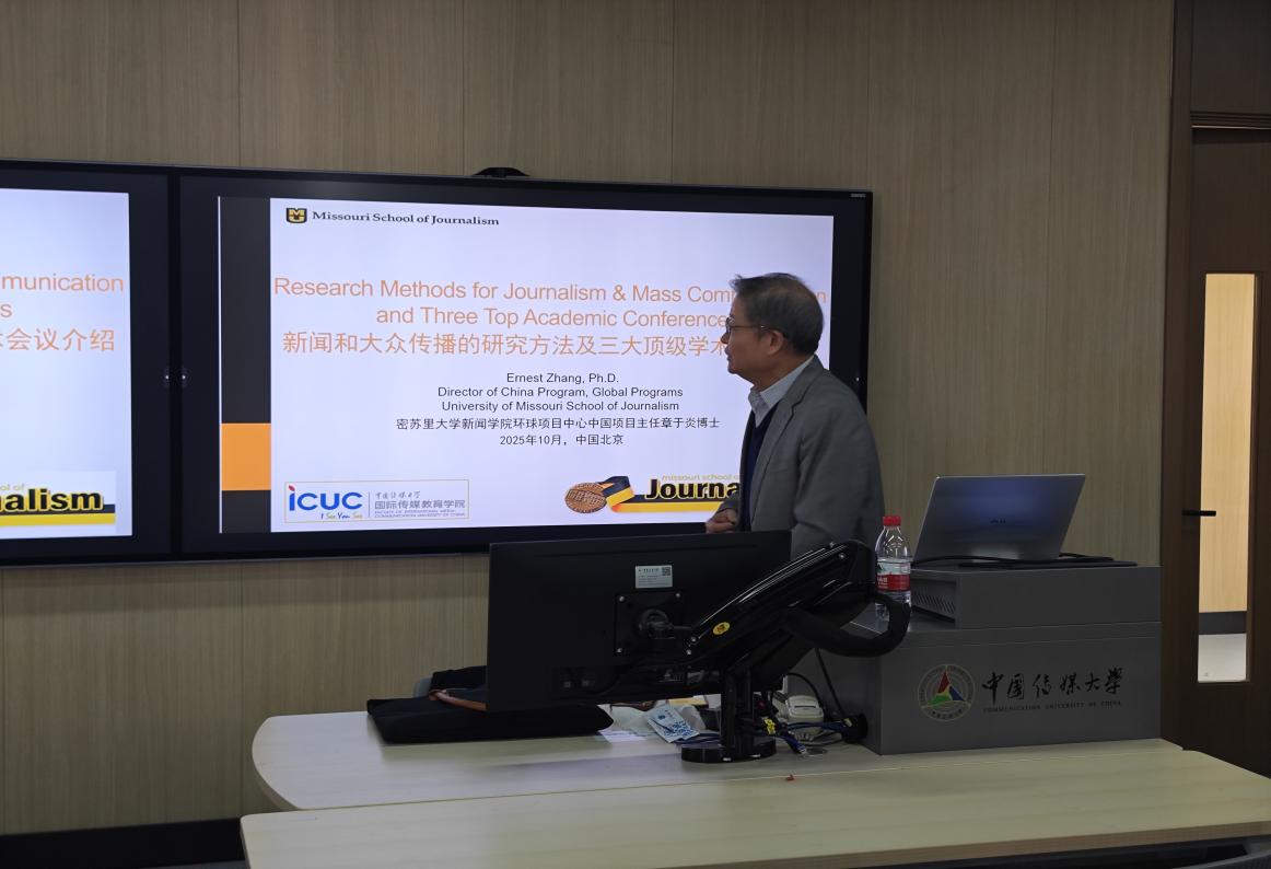(撰稿 王梓宇 摄影 王梓宇)2025年10月28日下午,密苏里大学新闻学院环球项目中心中国项目主任章于炎博士为2023级传播学同学进行了一场以“新闻和大众传播的研究方法及三大顶级学术会议”为主题的专题讲座。章于炎博士围绕传播学领域的核心研究方法、学术会议参与及典型研究案例展开深入讲解,为在场学生带来了一场内容丰富、案例详实的学术分享。讲座首先介绍了国际传播学领域三大顶级学术会议——NCA(美国全国传播协会)、AEJMC(美国新闻与大众传播教育协会)和ICA(国际传播协会),强调了参与国际学术交流对拓展研究视野、展示研究成果的重要意义,并且特别分享了多位同学在NCA等会议上发表论文的经历,鼓励学生积极投稿,提升学术能力。在方法论部分,章于炎博士系统梳理了原始研究与二次研究的区别,并重点讲解了定性研究与定量研究两大类方法。定性研究方面,结合深度访谈、焦点小组、案例研究、话语分析等方法,分享了其在媒体融合、形象修复等领域的研究实例;定量研究方面,则详细介绍了内容分析、问卷调查及卡方检验等方法,并以中美新闻传播课程比较研究为例,展示了如何通过量化手段验证研究假设。整场讲座内容详实、逻辑清