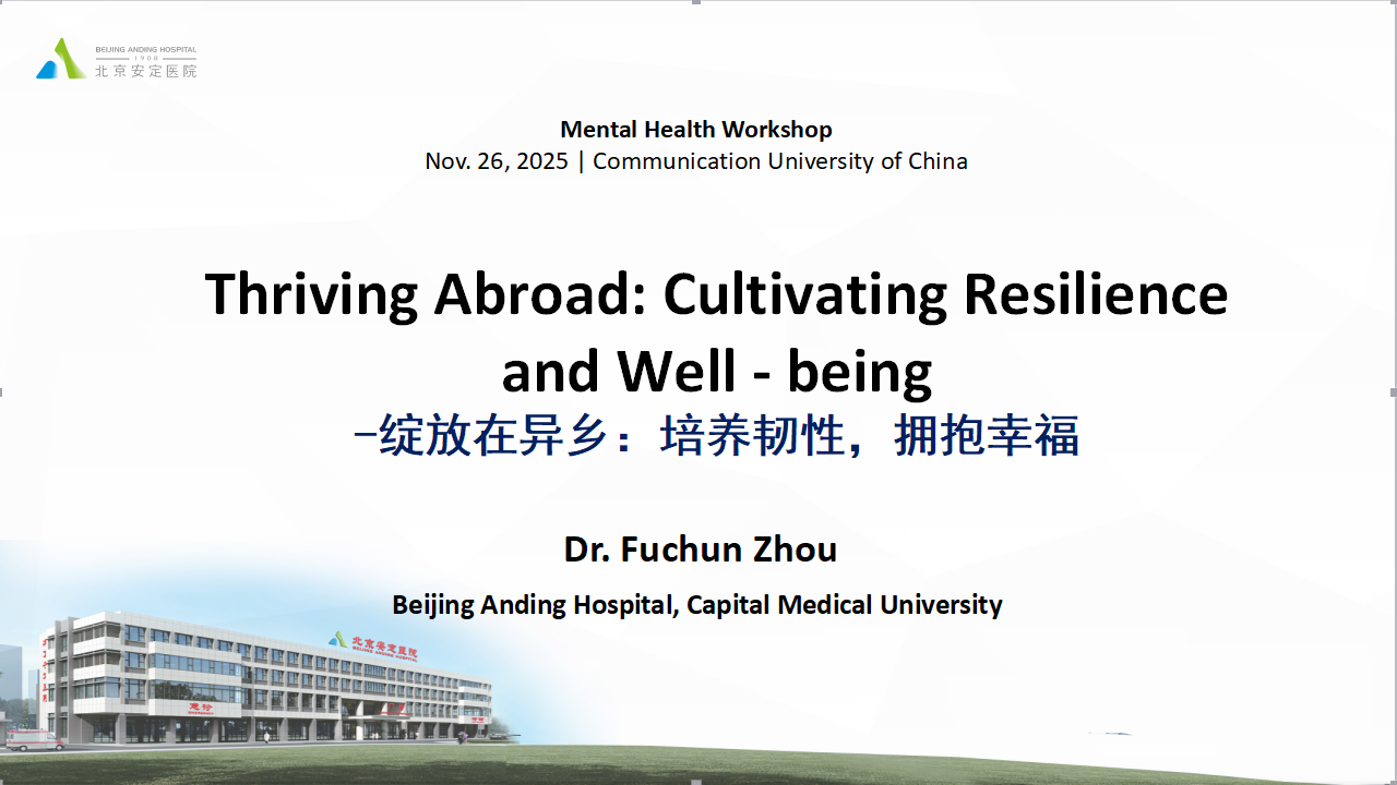 (通讯员 尹梦 摄影 黎沁瑶)为贯彻“以学生为本”的理念,更好地支持我校国际学生在京学习与生活,境外学生事务中心于11月26日下午举办“绽放在异乡:培养韧性,拥抱幸福”心理健康专题讲座。讲座特邀国内精神卫生领域专家、首都医科大学附属北京安定医院主任医师、首都医科大学精神卫生学院博士生导师周福春教授为在校国际学生带来一场兼具专业性与温度的心理健康分享。随着学校国际化水平不断提升,国际学生人数持续增长。初到异国,他们面临文化差异、语言障碍、学业压力、经济负担、思乡情绪及人际适应等多重挑战,这一“压力窗口期”对国际学生的心理韧性提出了更高要求。基于此,境外学生事务中心精心策划本次讲座,旨在将心理支持予以前置,为国际学生提供及时而实用的心理健康资源。讲座伊始,周福春教授以“提到留学,你想到的第一个词是什么?”的互动提问迅速拉近与学生的距离。他指出,面对陌生环境出现情绪波动或适应困难是正常的应激反应,不代表个人脆弱,关键在于如何从压力中汲取成长的力量。周教授从专业角度解析了压力的情绪、认知与行为表现,将其比喻为“大脑内部的警报系统”。他结合案例介绍了留学生中常见的抑郁、焦虑、物质滥用及进食障