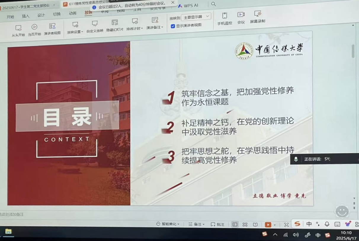 (通讯员 程牛思瑶 摄影 周飏)2025年6月17日下午,国际传媒教育学院为学院全体毕业生党员开展专题教育,学院党委书记龙俊、五级组织员赵洪斌出席。本次专题教育分两部分进行。第一部分,邀请马克思主义学院赵波老师以“锤炼党性提高思想觉悟 自觉从党的创新理论中汲取党性滋养”为主题讲授专题讲座。