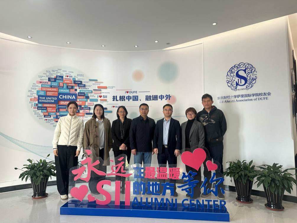 次日,调研团队前往东北财经大学继续调研。萨里国际学院副院长孟妹陪同调研团队实地参观了教学场地与办公环境,直观感受学院办学氛围。