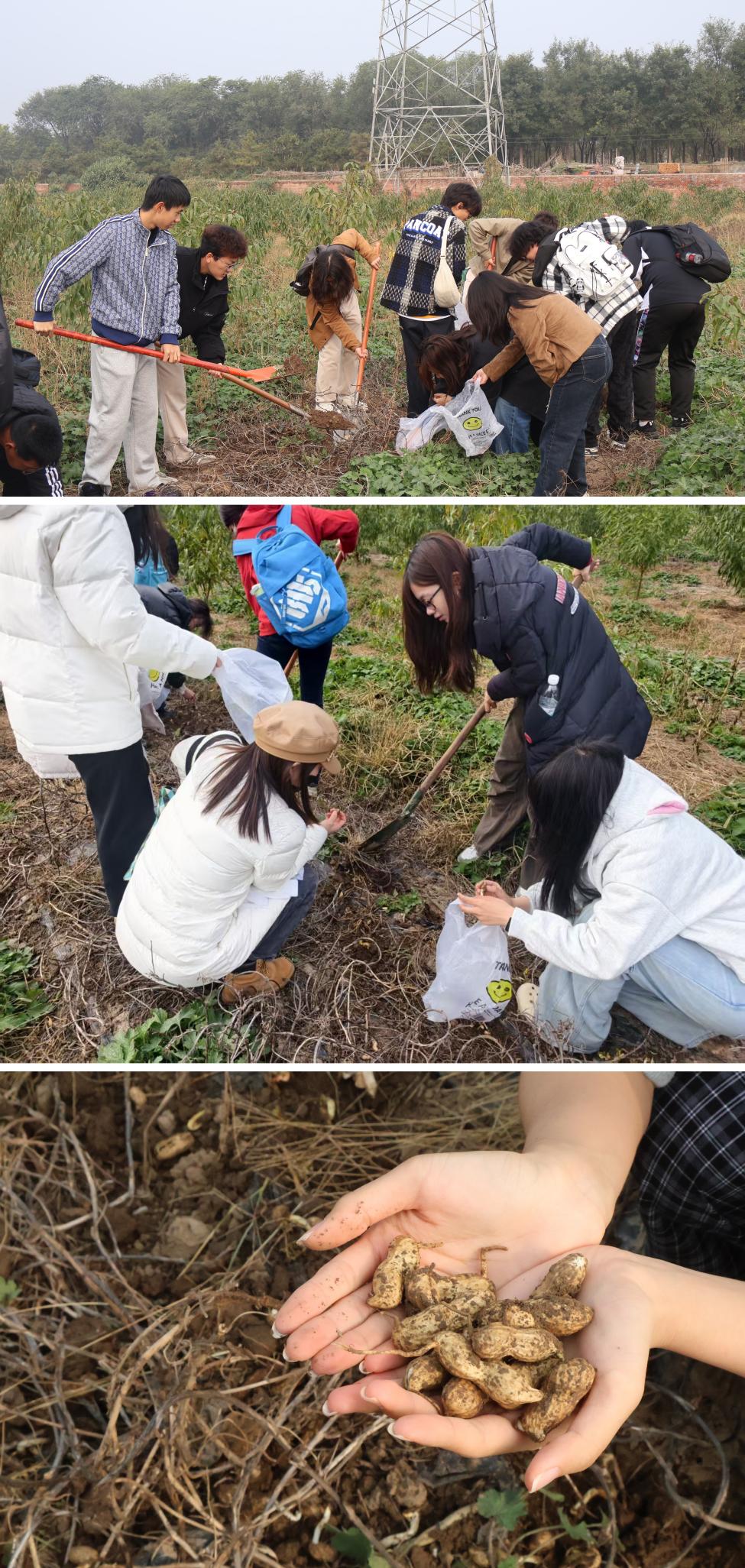 走出展馆,农业实践区的景象让同学们兴致盎然。大家走进葡萄种植大棚,参观藤架上累累果实,了解现代农业种植技术。随后,老师和同学们一同走进花生地,亲身体验劳动实践:有的弯腰刨土、细心捡拾花生果实,有的挥动铁锹、翻动泥土,在汗水与笑声中体会劳动的收获与喜悦。