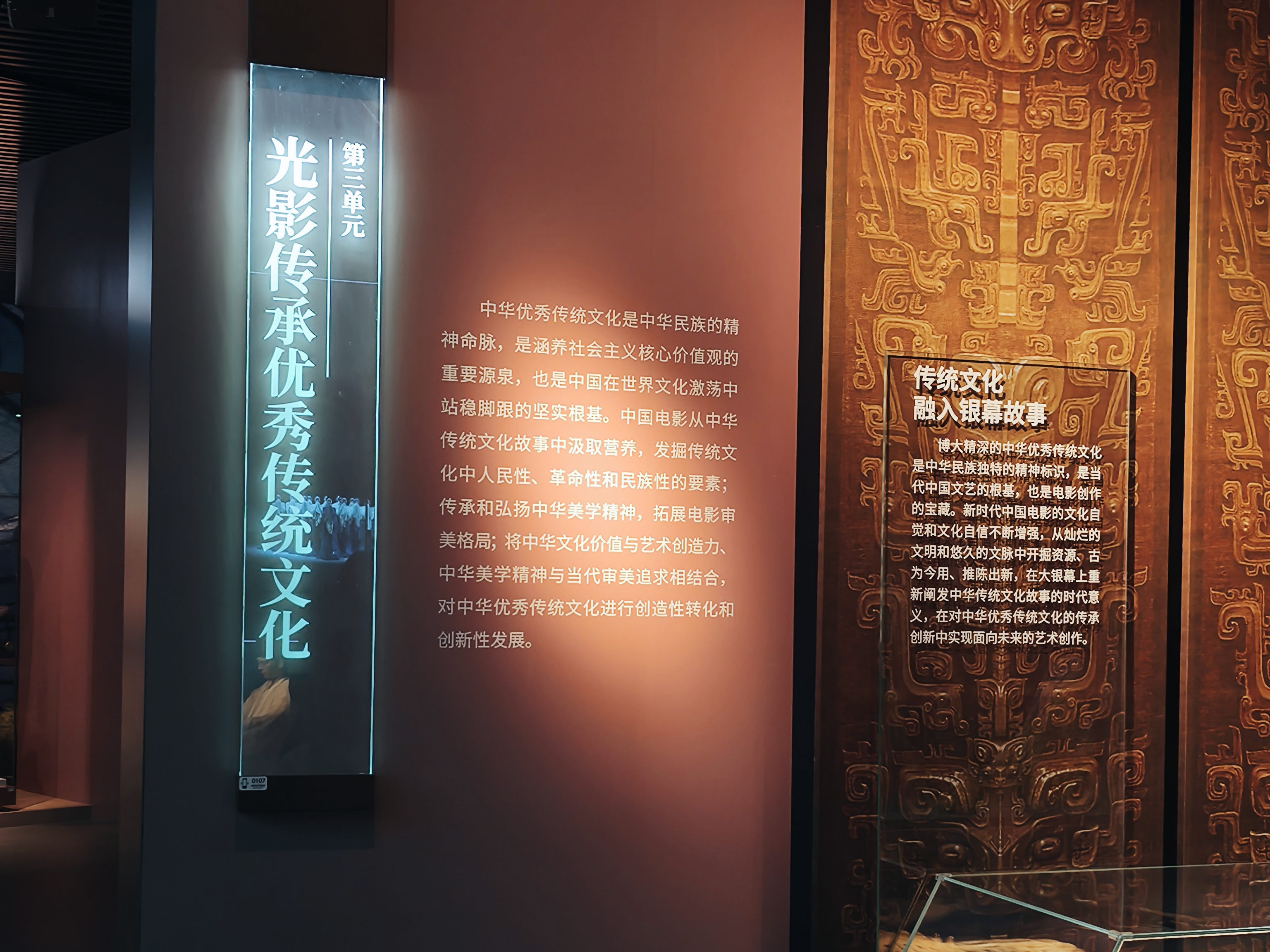 此次展览是中国电影诞生120周年纪念展。展览以主题单元的形式呈现,整体追溯了中国电影发展的历史,向参观的师生生动叙述了中国电影的发展历程和伟大成就。其中一个单元聚焦传统文化融入电影的历程,强调中国电影如何汲取民族精神遗产,培育文化自信与艺术创新。题为“碧水青山是无价之宝”的展区也令观者动容,多省取景影片充分展现视听语言对中国地域风光的多样化呈现,让师生领略了20年以来中国可持续发展的理念贯彻和重要实践。