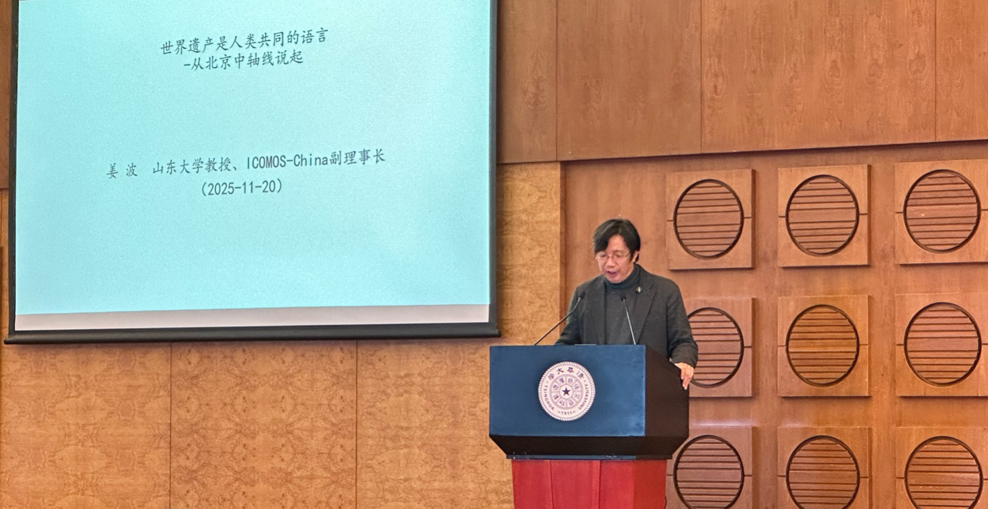 随后,中国古迹遗址保护协会副理事长姜波围绕北京地区文化遗产概况进行专题授课。他以北京中轴线为核心案例,深入阐释世界遗产作为“人类共同语言”的价值,强调其历史、艺术与文明意义,并展示了中国与世界各地文化遗产之间的交流互鉴,凸显遗产在理解人类文明与塑造未来发展中的重要作用。