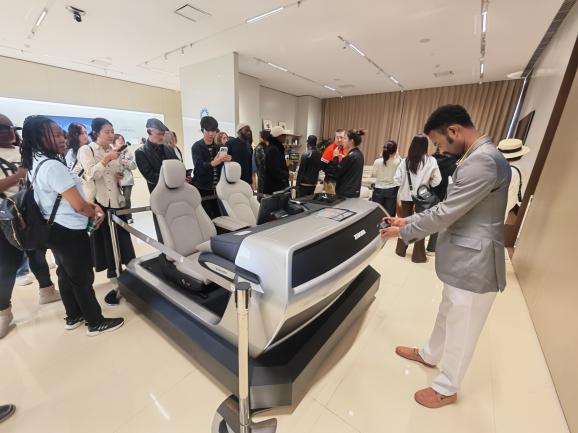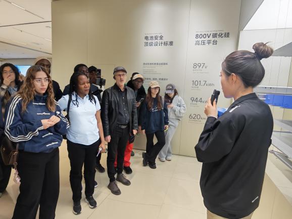 师生们在工作人员引导下,先后参观了小米汽车综合楼展厅与核心生产车间。在综合楼的汽车展厅与技术展厅,大家全面了解小米汽车的品牌理念、产品矩阵与技术创新方向,从智能座舱设计到三电核心技术,从用户体验优化到全场景生态布局,直观感受科技与出行深度融合的魅力。现场讲解细致生动,中外师生不时驻足交流,对智能汽车产业的发展趋势有了更清晰的认知。