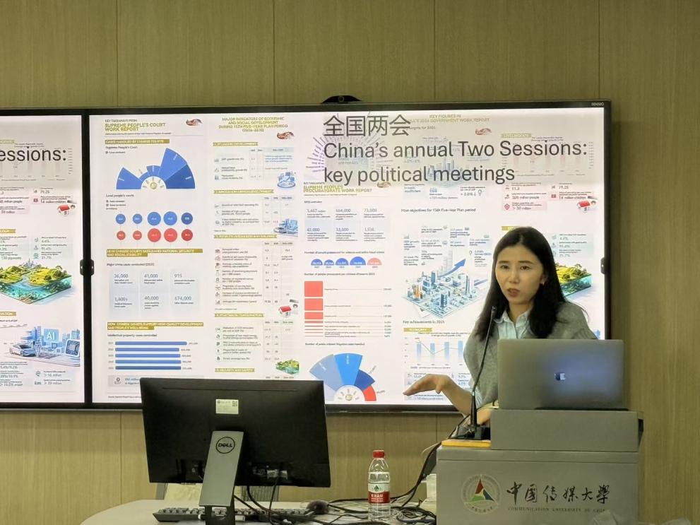 讲座中,赵红从“什么是数据”与“如何寻找数据”切入,结合自身多年国际传播与数据新闻实践经验,系统介绍了数据新闻的生产流程与叙事逻辑。她通过展示CGTN数据新闻作品,如以中国发展为主题的可视化项目以及相关互动网页,生动呈现了数据如何转化为具有传播力的新闻内容,增强了同学们对数据叙事的直观理解。在技术应用方面,赵红还对比了传统新闻视频与AI辅助制作的差异,指出人工智能在数据分析、可视化呈现等方面的潜力,为新闻生产带来了新的可能。