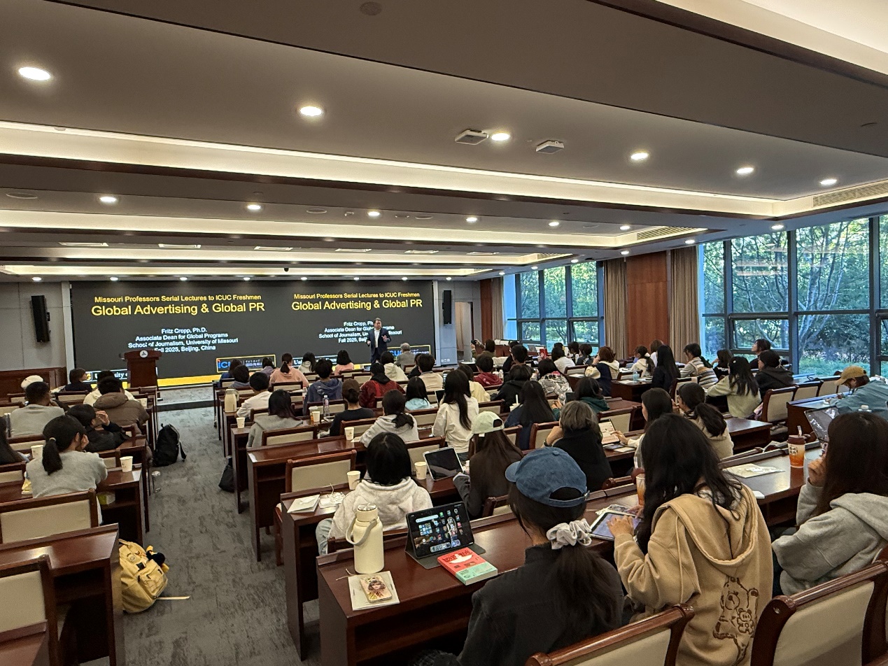 (通讯员 陈宣妤)2025年10月13日下午,国际传媒教育学院邀请密苏里大学新闻学副院长Fritz Cropp博士举行“Global Advertising Global PR”系列讲座,以增进2025级传播学新生对新闻传播领域全球广告与全球公关基础和前沿的理解。 讲座伊始,Fritz Cropp博士对密苏里新闻学院的教育模式与课程特色作了简单介绍。随后,Fritz Cropp博士从新闻学院课程的重要组成部分——战略传播引入,从全球化趋势背景、价值与文化、创新传播理论等方面进一步展开阐释。期间,通过丰富的图片展示与视频播放,同学们从生动的实例中积极思考广告价值、探索发展全球品牌及推进本地化工作的策略,加深对本堂讲座的内容认知。在最后的总结环节,Fritz Cropp博士强调感知的关键作用以及在全球化过程中文化融合与交流的重要性。本次讲座在气氛活跃的互动问答环节中画上句号。 此次讲座使同学们了解了“全球化”如何改变战略传播领域,同时也为未来四年国际化环境下学习传播学专业的进一步做了铺垫。